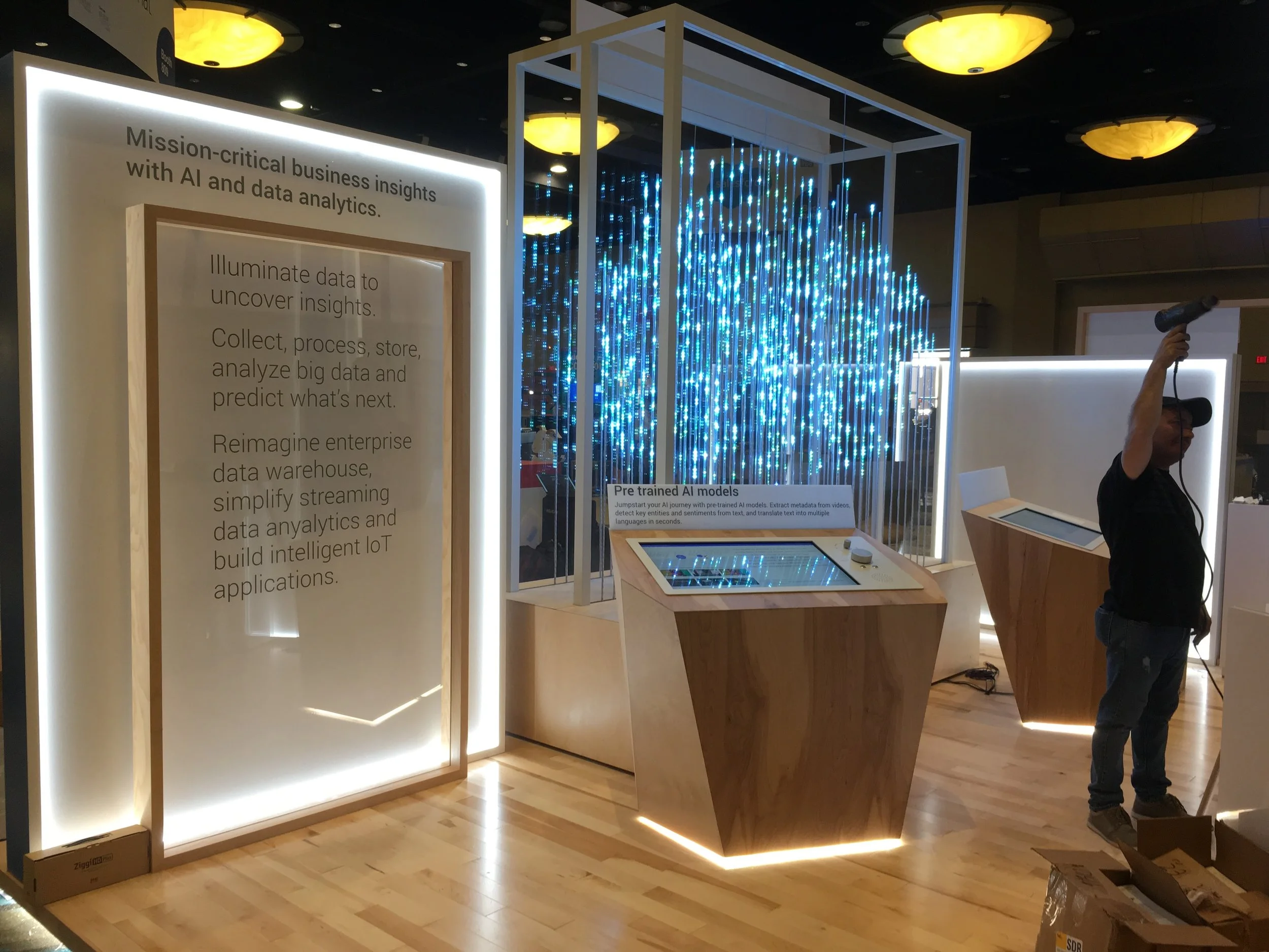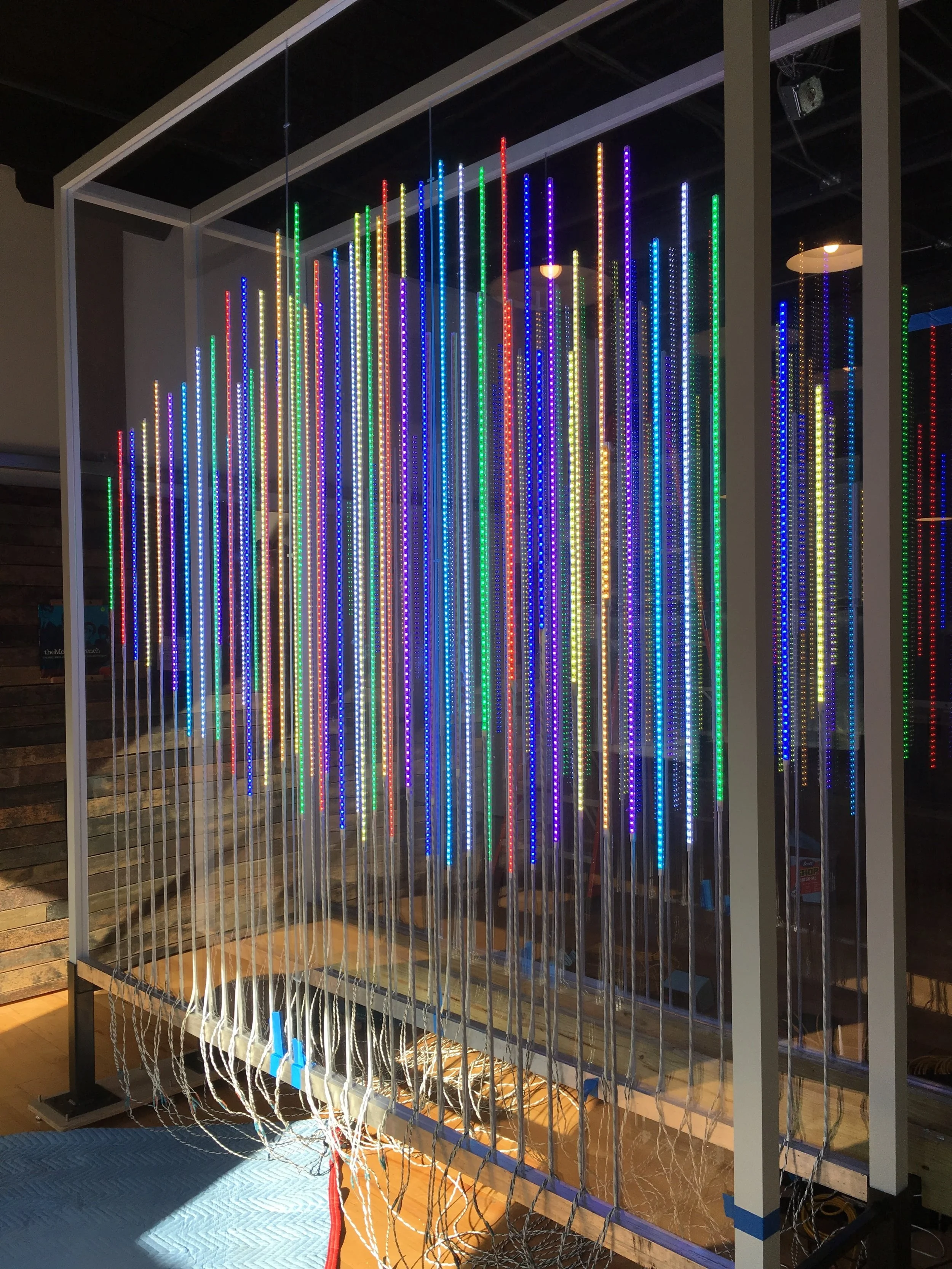 I designed and built two steel UX panels, and helped fabricate and assemble 200 square feet of acrylic LED panels. Strips were laid on both sides of routed acrylic, and staged in three depth planes to create an abstract holographic effect. I mapped live generative art onto the cloud of LEDs, to create a dynamic light sculpture that responded to attendees’ actions.
